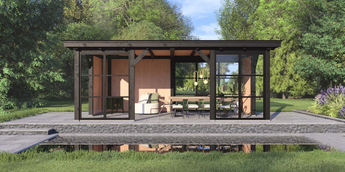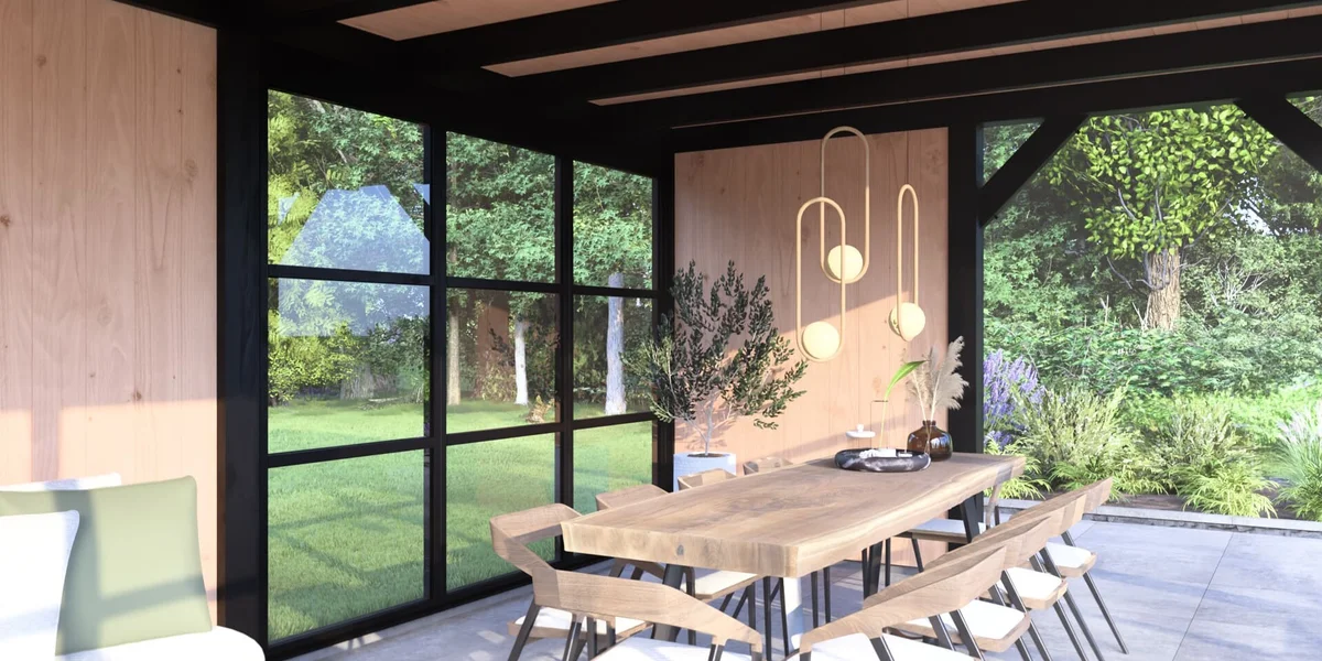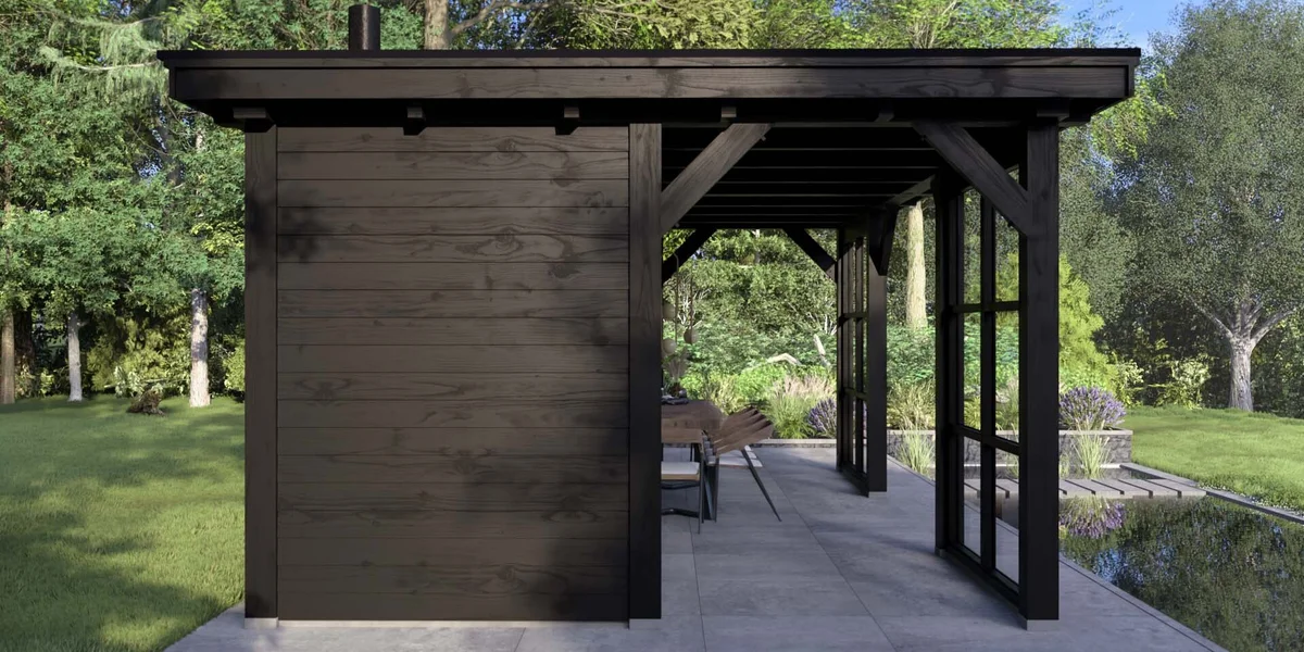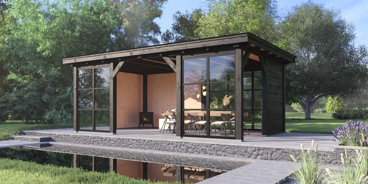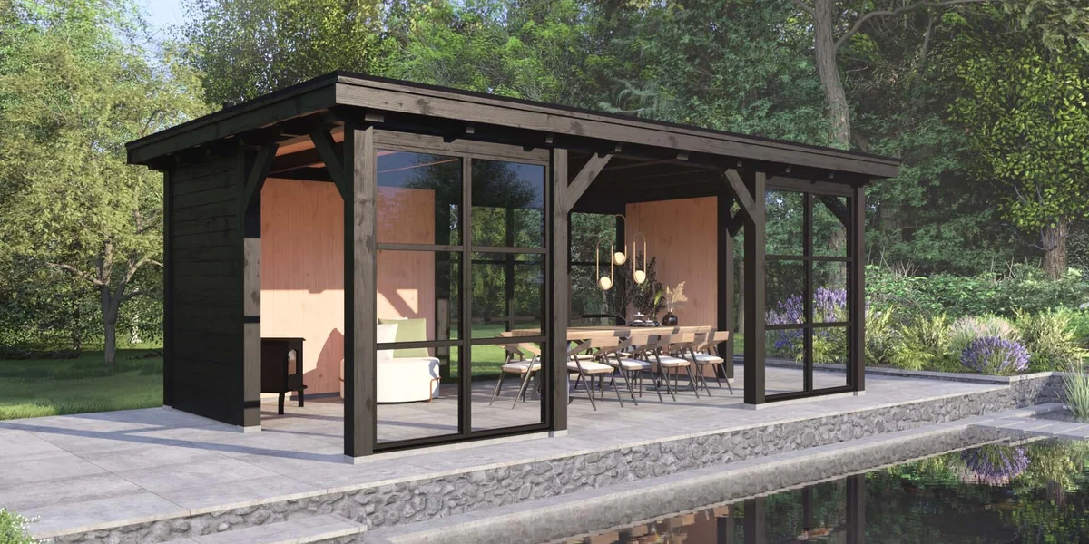 Het buitenverblijf Brussel biedt een perfecte mix van modern ontwerp en landelijke charme. Dit platdak buitenverblijf is uitgevoerd met authentieke zwaluwstaartverbindingen in de ronde overstekklossen, wat zorgt voor een naadloze afwerking.