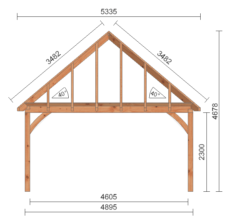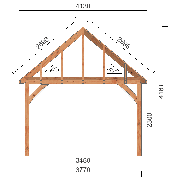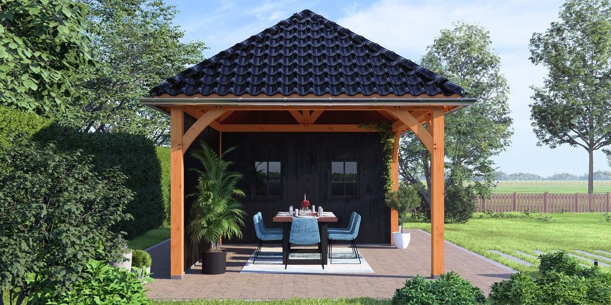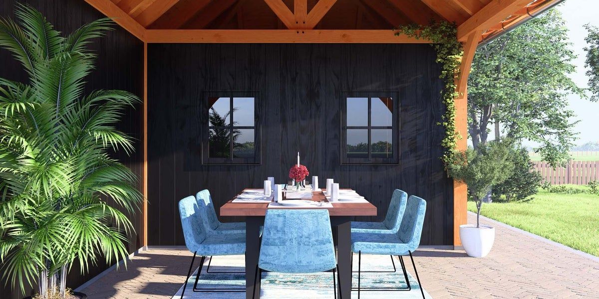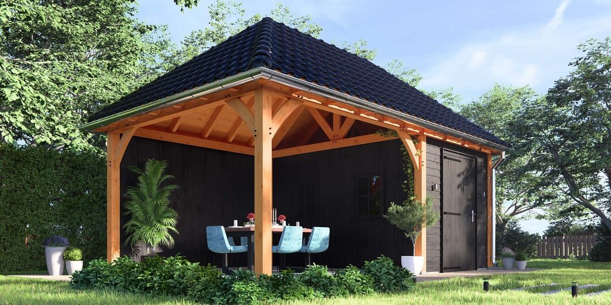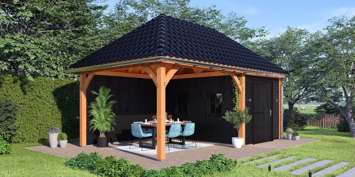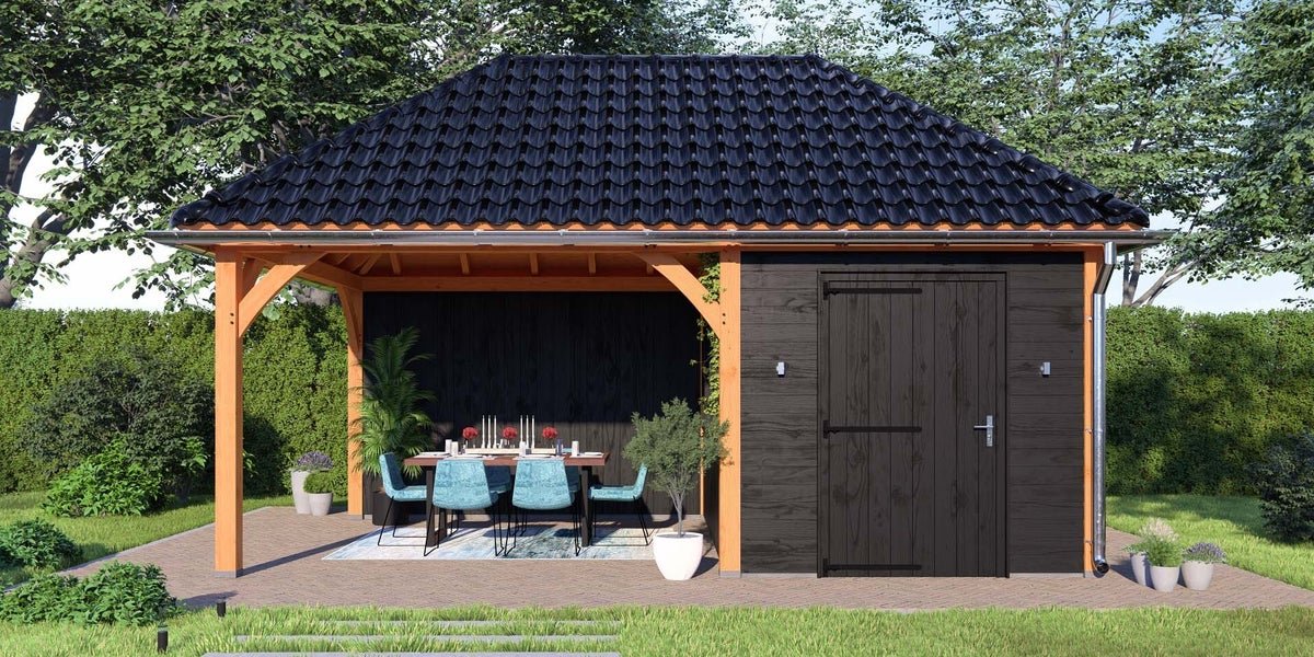 Schildkap Dublin biedt een praktische en sfeervolle aanvulling aan uw tuin of erf. Bovendien dragen de ronde schoren bij aan de rustieke uitstraling. Het ontwerp past bij onder andere een traditionele boerderij en kan worden voorzien van een vide, waardoor het ook kan functioneren als schuur of opbergplek.