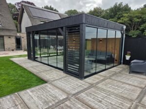 Dit buitenverblijf is uitgevoerd met een vaste glaswand en een schuifglaswand die subtiel achter de shutters doorloopt. Daardoor lopen binnen en buiten op een natuurlijke manier in elkaar over. Tegelijk zorgt deze opstelling voor veel lichtinval en de mogelijkheid om het buitenverblijf bij mooi weer volledig te openen.