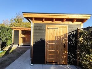 Naast het hoofdverblijf hebben we een compact, maar essentieel schuurtje gerealiseerd. Dit zorgt voor discrete en praktische opbergruimte, waardoor het luxe karakter van de buitenkamer behouden blijft.