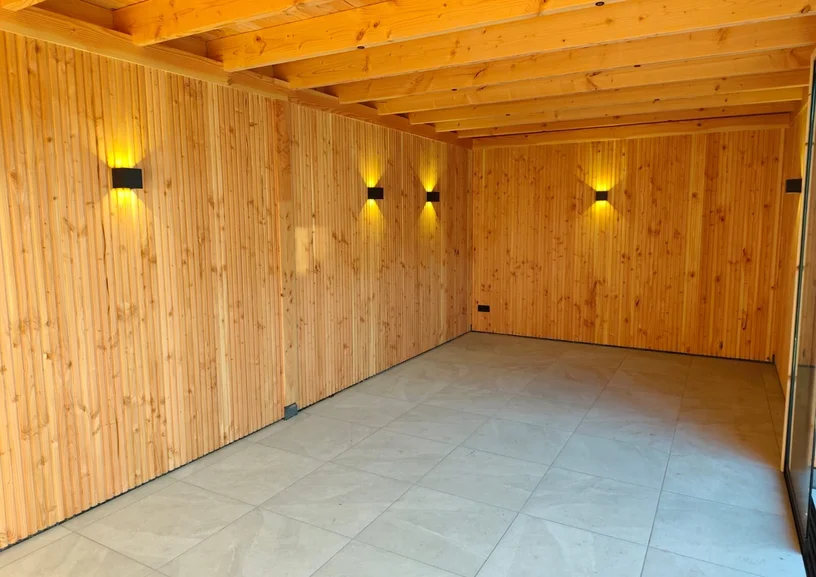 Het interieur, daarentegen, straalt warmte en sfeer uit. Hier is gekozen voor Deens Rabat van hoogwaardig Douglas hout. De lichte, natuurlijke kleur en het verfijnde profiel van het Douglas hout creëren een uitnodigende ruimte waar men zich direct thuis voelt, ideaal als tuinkantoor, gastenverblijf of relaxruimte.