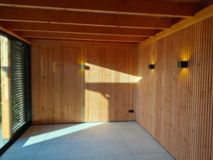 Het interieur, daarentegen, straalt warmte en sfeer uit. Hier is gekozen voor Deens Rabat van hoogwaardig Douglas hout. De lichte, natuurlijke kleur en het verfijnde profiel van het Douglas hout creëren een uitnodigende ruimte waar men zich direct thuis voelt, ideaal als tuinkantoor, gastenverblijf of relaxruimte.
